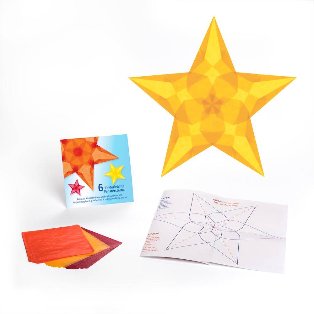De complete set bevat 45 vellen pergaminepapier voor zes heldere raamsterren van ongeveer 20 cm in diameter. De gemakkelijk te begrijpen instructies maken het mogelijk om deze prachtige sterren te vouwen met kinderen.