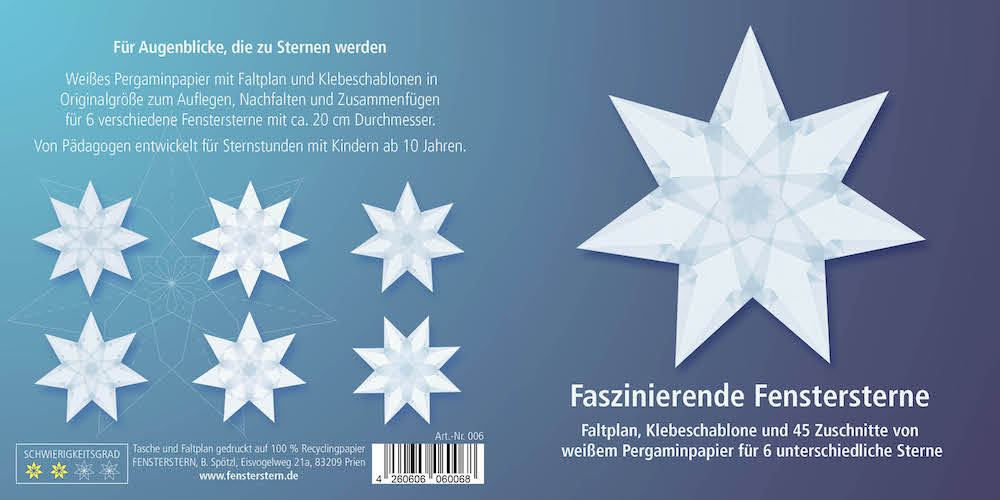 De complete set bevat 45 vellen pergaminepapier voor zes heldere raamsterren van ongeveer 20 cm in diameter. De gemakkelijk te begrijpen instructies maken het mogelijk om deze prachtige sterren te vouwen met kinderen.