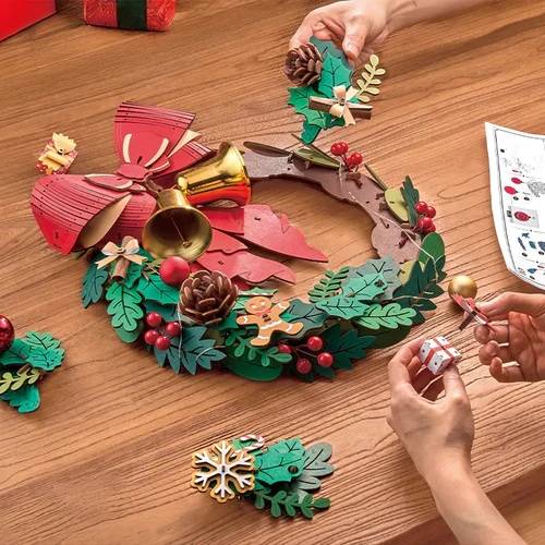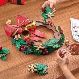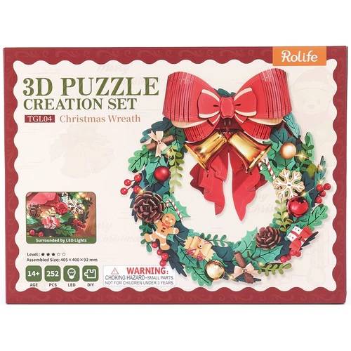 Christmas wreath is een houten bouwpakket van Robotime geschikt voor voornamelijk volwassenen, maar kinderen vanaf 8 jaar kunnen meehelpen bouwen. De fraaie kerstkrans is gehouden in traditionele kerstkleuren, goud, rood en groen. We vinden ook de vertrouwde kerstversieringen terug als kerstballen, strikjes, pakjes en dennenappels. De krans is mooi volbeladen met voorwerpen waardoor het echt de kerstsfeer oproept.