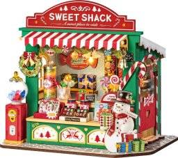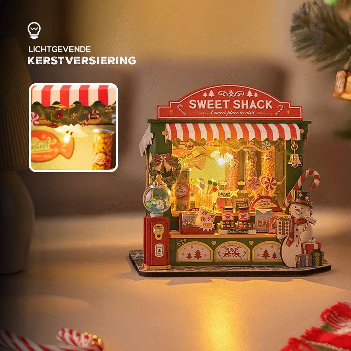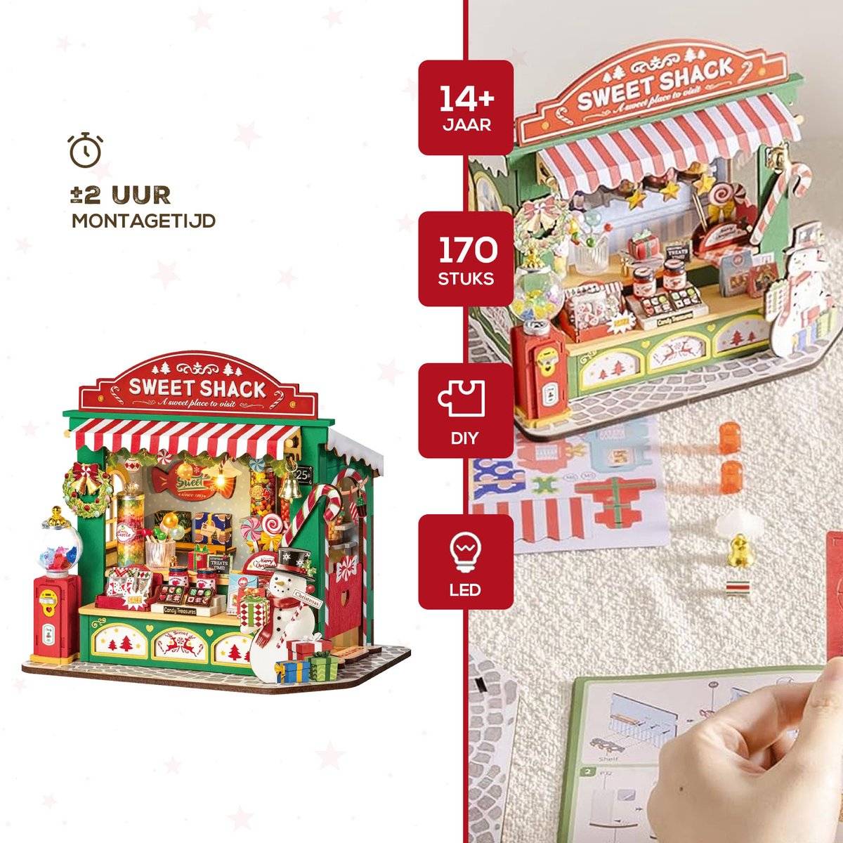 De Christmas Candy Stand, het zoete schuurtje, is een houten bouwpakket van Rolife. De onderdelen druk je met je vingers uit de houten platen of ze zitten in zakjes. Ze worden eenvoudig in elkaar geklikt, je hebt geen lijm nodig! Dankzij het handige snapfit-systeem en het dubbelzijdig plakband kun je dit miniatuurwinkeltje bouwen zonder gereedschap. De ledverlichting maakt het helemaal af, terwijl je stap voor stap de luifel, de toonbank vol koekjes, de snoepautomaat en de bel die écht rinkelt in elkaar zet. Dit bouwpakket is geschikt voor iedereen vanaf 14 jaar.