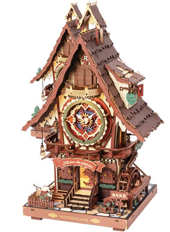 koekoeksklok is een uitdagend houten bouwpakket voor volwassenen en jeugd vanaf 14 jaar van een echt werkende koekoeksklok. Gebaseerd op het sprookje Wonderland van de schrijver Lewis Carroll is dit een levensgroot model met hints naar het verhaal. We zien het witte konijn terug, diverse speelkaarten en een mooie spreuk uit het sprookje. Ledverlichting is bijgesloten. Het geheel is een snoeperig droomhuisje waar ook van alles aan beweegt, zelfs een waterrad.