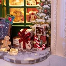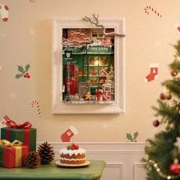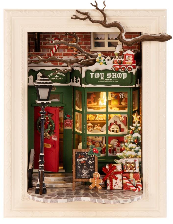 Santa's Toyshop van Robotime is een superknus houten bouwpakket met ledlampje in de vorm van een 3D-schilderij voor volwassenen en kinderen vanaf 14 jaar ongeveer. Dit tafereel stelt een kerstwinkel voor zoals we die in de vorige eeuw zagen in Engeland. Een erker met kleine ruitje, sneeuw, kerstboom, alles ademt kerst uit. De sfeervolle details zijn erg geliefd bij modelbouwers van miniaturen.