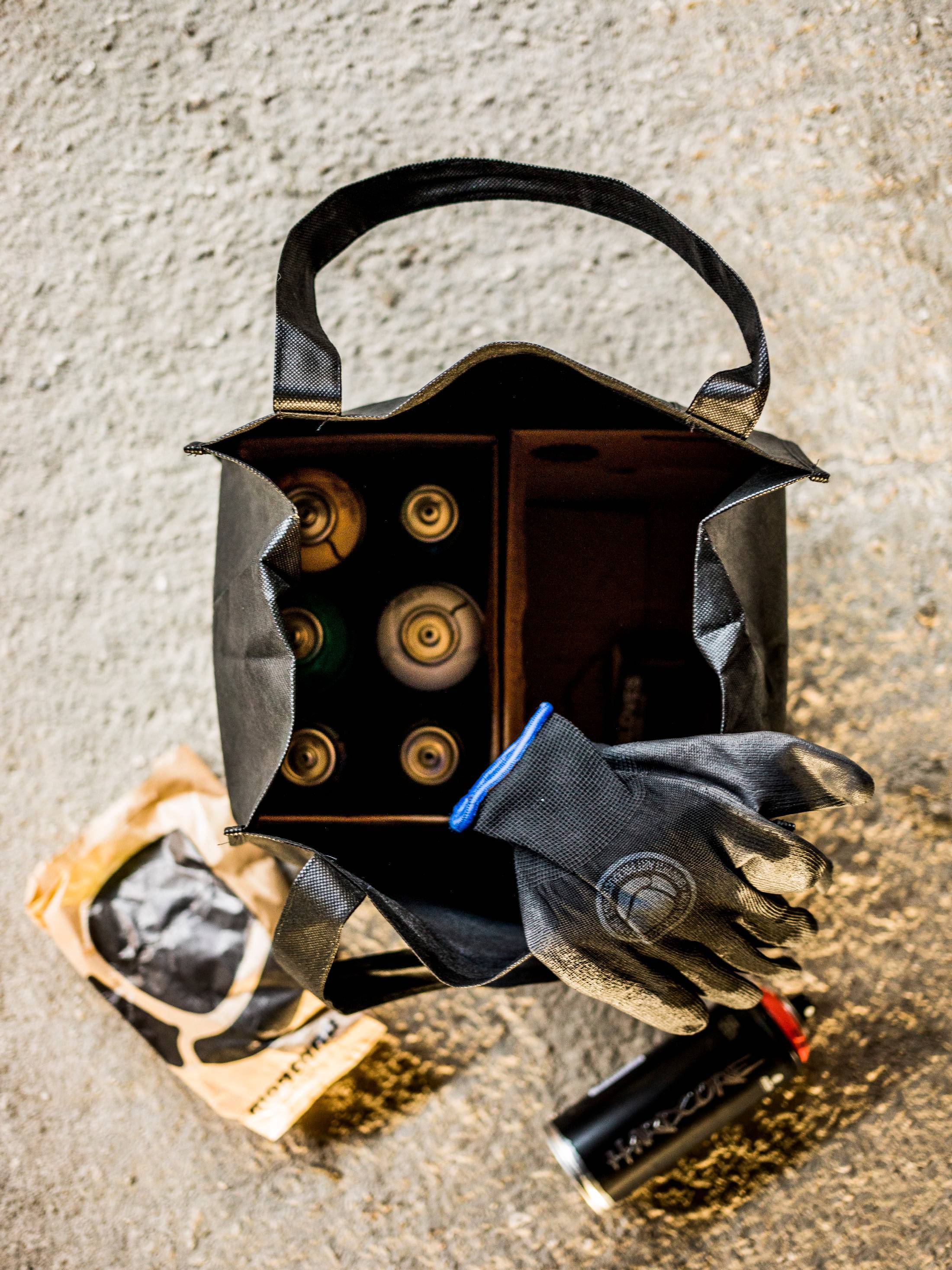 Deze vierkante tas is stevig genoeg om 16 spuitbussen in mee te nemen.