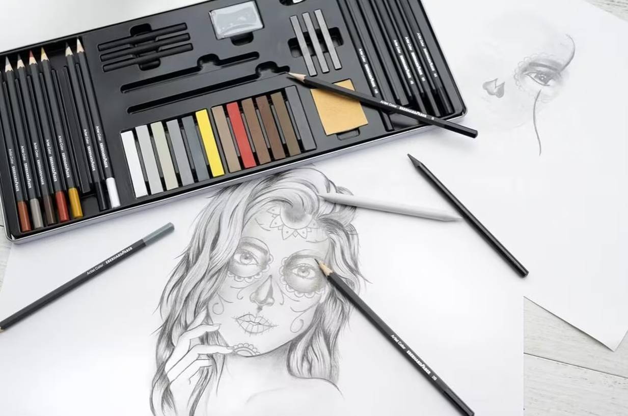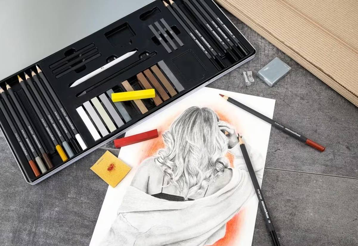 Inhoud van het blik: 6 tekenpotloden (HB, B, 2B, 4B, 6B, 8B), 3 x geperst houtskool ( soft, medium en hard), 1 kneedgum, 1 doezelaar, 1 metalen puntenslijper, 12 kleuren pastelkrijt (kleur :wit, cadmiumgeel, gebrande sienna, koudgrijs V, koudgrijs IV, warmgrijs IV, warmgrijs I, nougat, Venetiaans rood, caput mortuum, gebrande amber, donker sepia), 3 grafietpotloden (2B,4B en 6B), 2 x schuurpapier, 1 grafietpotlood pure en 8 kleurpotloden (kleuren: wit, gebrande sienna, sanguine, Napels geel, van Dyck bruin, koudgrijs, warmgrijs en zwart).
