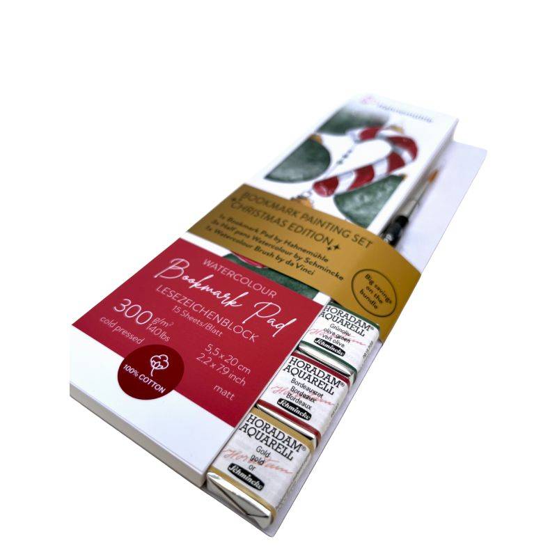 De set bevat 15 aquarel boekenleggers om te schilderen, drie halve napjes Schmincke aquarelverf in feestelijke kleuren en een hoogwaardig Da Vinci Penseel. Deze miniset is ideaal voor het maken van delicate kunstwerkjes om cadeau te doen of om in uw favoriete boeken te verstoppen.