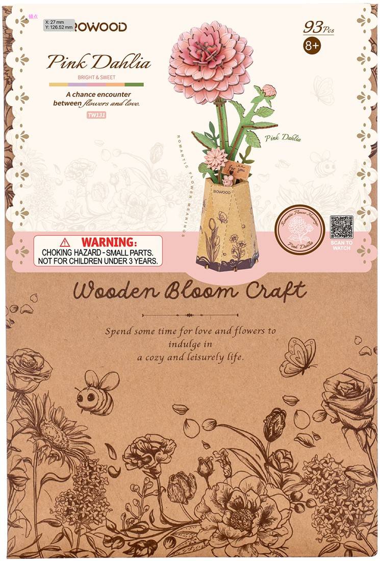 De Rowood Pink Dahlia is een houten bouwpakket voor volwassenen en vanaf 14 jaar. Het brengt kleur en vrolijkheid in het interieur zonder ooit te verwelken. De rijk gevormde houten bloemblaadjes creëren een volle, ronde bloem met zachte en levendige roze tinten. Een tweede dahlia in knop en het kartonnen vaasje met bloem- en vlinderillustraties zorgen voor een frisse, optimistische uitstraling en maken dit decoratieve object tot een blikvanger.