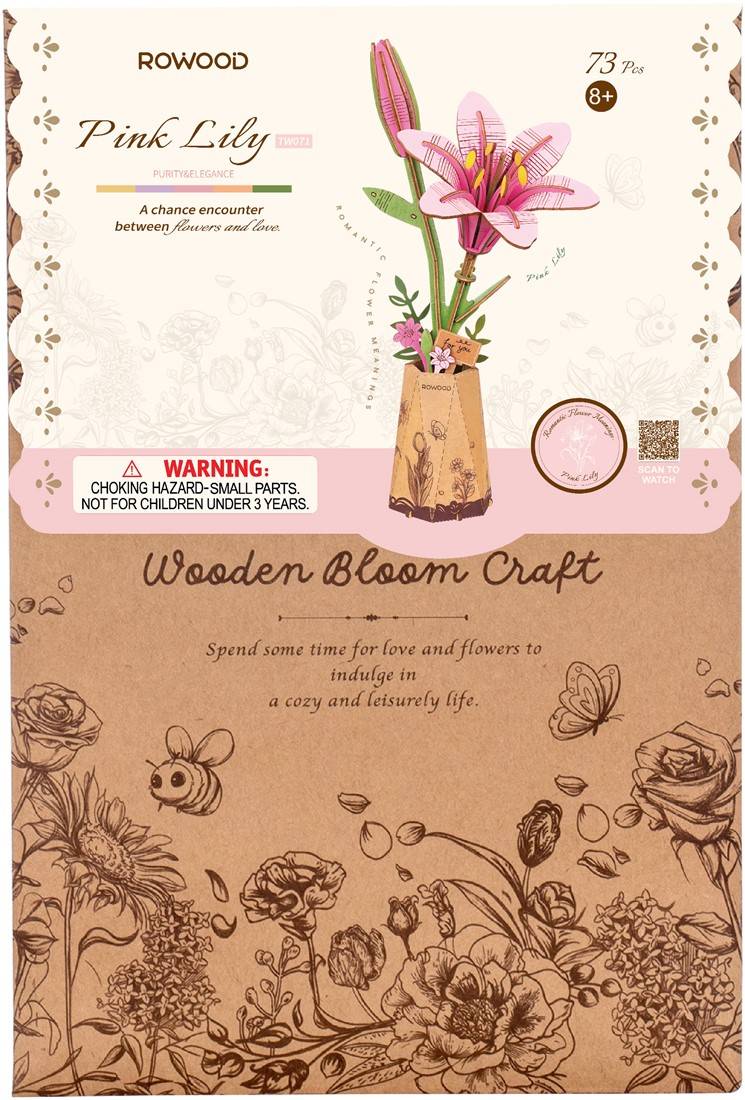 De Robotime Pink Lily / Roze Lelie is een houten bouwpakket van Rowood, geschikt voor volwassenen en kinderen vanaf 8 jaar. Deze mooie lelie heeft zachte en felroze tinten, met gele stampers. Het ontwerp bevat een bloem in de knop en een andere in volle bloei. De taps toelopende kartonnen vaas is bedrukt met bloemen. Er staan extra bloemetjes op de bodem en een kaartje for you.