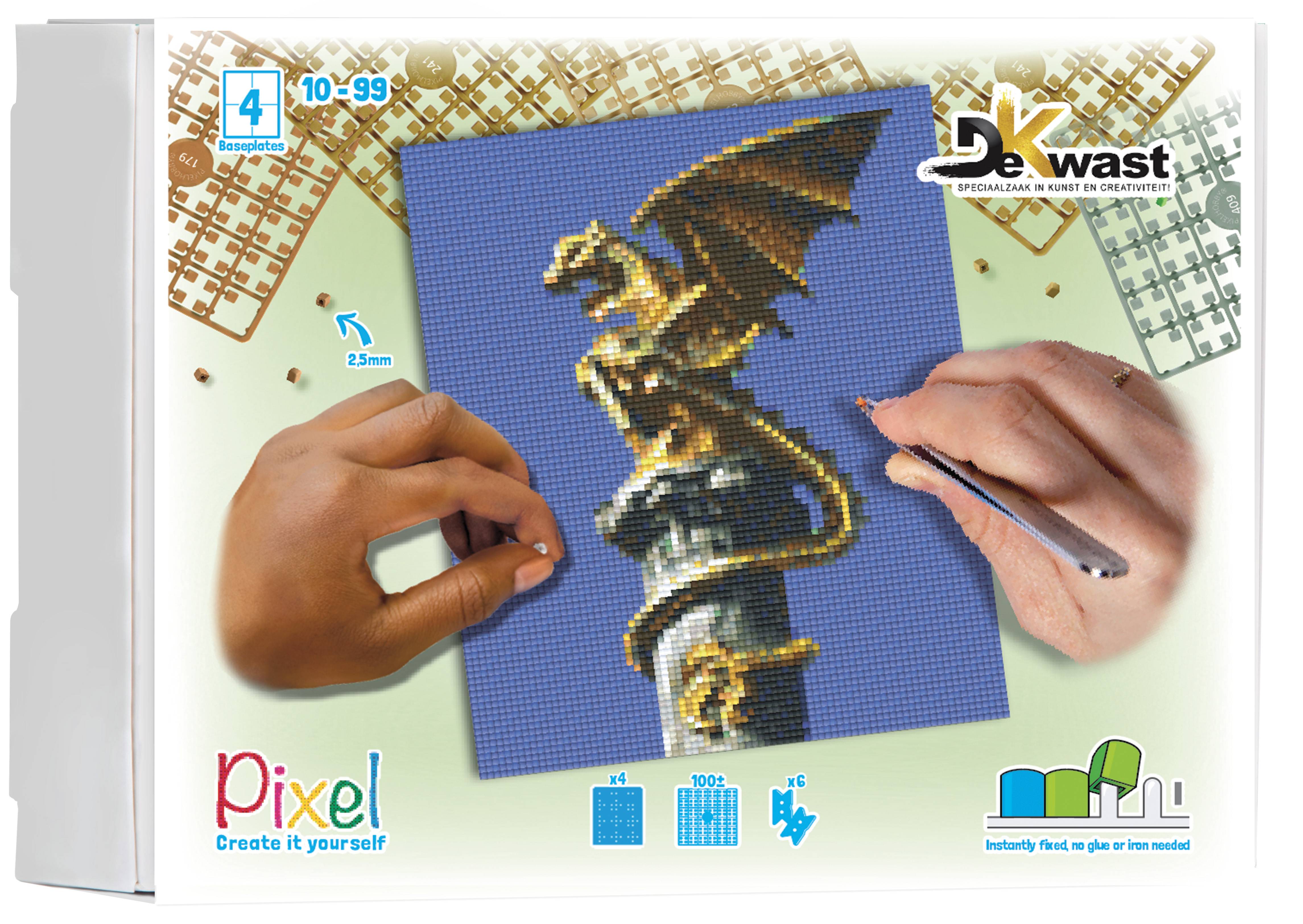 Complete set om een pixelschilderij van De Bossche Draak te maken op 4 basisplaten met klassieke pixels van Pixelhobby. Je pixelschilderij wordt 20x25cm