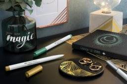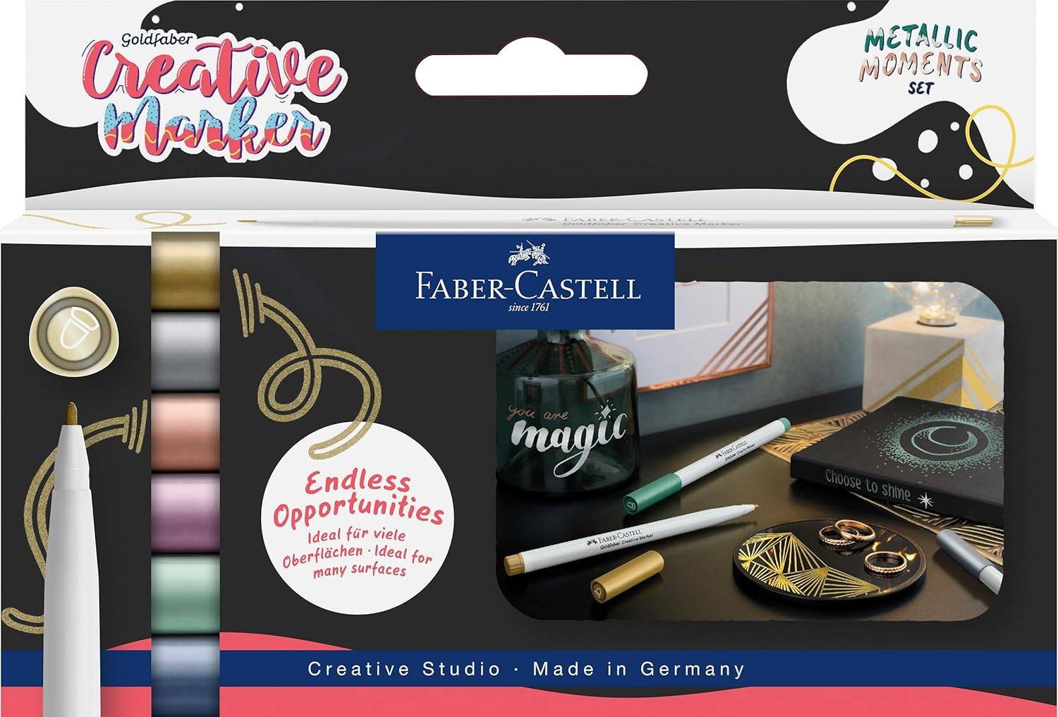 Goldfaber Creative Marker met een bulletpoint (1.5) een echte allrounder voor uiteenlopende creatieve projecten, zoals handlettering, doe-het-zelfprojecten en upcycling. Deze marker is perfect geschikt voor gebruik op alle soorten papier, van licht tot gekleurd en zelfs donker papier. Daarnaast hecht het ook uitstekend op diverse andere oppervlakken, waaronder karton, glas, folie, keramiek, kunststof, terracotta, hout, metaal en steen. Dankzij de geurloze inkt op waterbasis is schudden of pompen niet nodig, en bovendien bloedt de inkt niet door het papier heen. De marker is veeg- en spatbestendig en wordt watervast na 30 minuten fixeren in de oven op 160°C. Houd er wel rekening mee dat de inkt niet vaatwasbestendig is. Set met 6 kleuren Metallic Moments (550, 551, 552, 553, 590, 594).