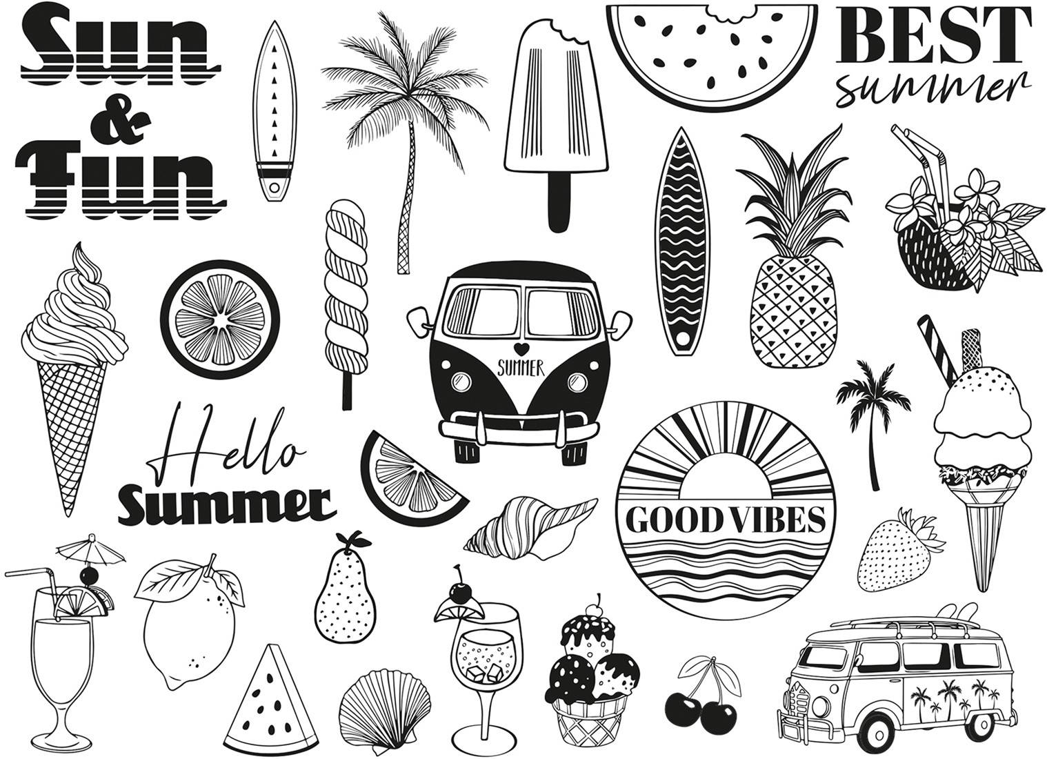 Deze vrolijke en veelzijdige set bevat 29 verschillende schuimstempels met allerlei Zomersemotieven, perfect voor het versieren van kaarten, uitnodigingen, scrapbooks, cadeauverpakkingen, labels of bullet journals.