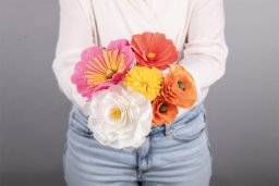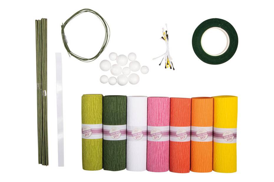 Deze geurige bloemen verspreiden zomerse vrolijkheid en verwelken gegarandeerd niet. Maak je eigen papieren bloemen – met deze doe-het-zelf-kit creëer je een verscheidenheid aan crêpepapierbloemen in prachtige kleuren.