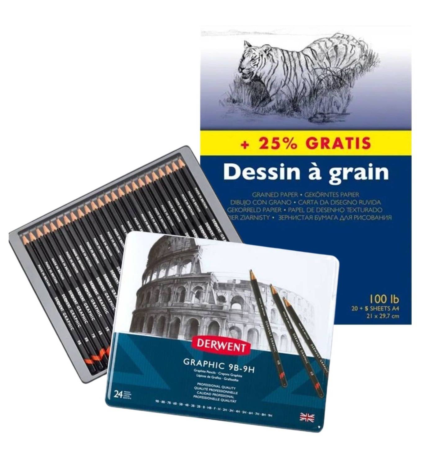 Mooie set met Derwent tekenpotloden inclusief een blok tekenpapier van Clairefontaine.