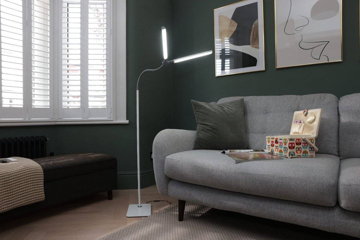 Deze slanke, flexibele vloerlamp heeft een modern design en een slanke afwerking. Het heeft twee afzonderlijk instelbare tinten waarmee een hoge lichtopbrengst over een zeer groot licht of een intens licht over een klein gebied mogelijk is. Flexibele arm richt licht precies waar u het nodig hebt en 56 heldere LED's van hoge kwaliteit zorgen voor een nauwkeurige kleurafstemming. Het heeft een aanraakschakeldimmer met 4 helderheidsniveaus. Uitermate geschikt voor kunst, handwerk, lezen of in een salon.