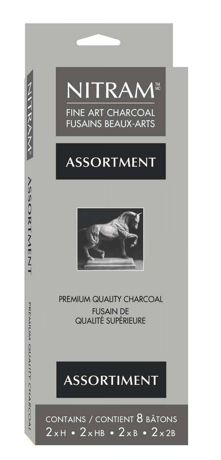 Set met 8 geassorteerde Nitram ronde houtskoolstaafjes met diameter 5mm en 6mm.