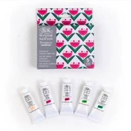 Set 'Botanical colours' met 5 tubes 14ml: pale rose blush, opera pink, bengal rose, sap green en viridian hue.