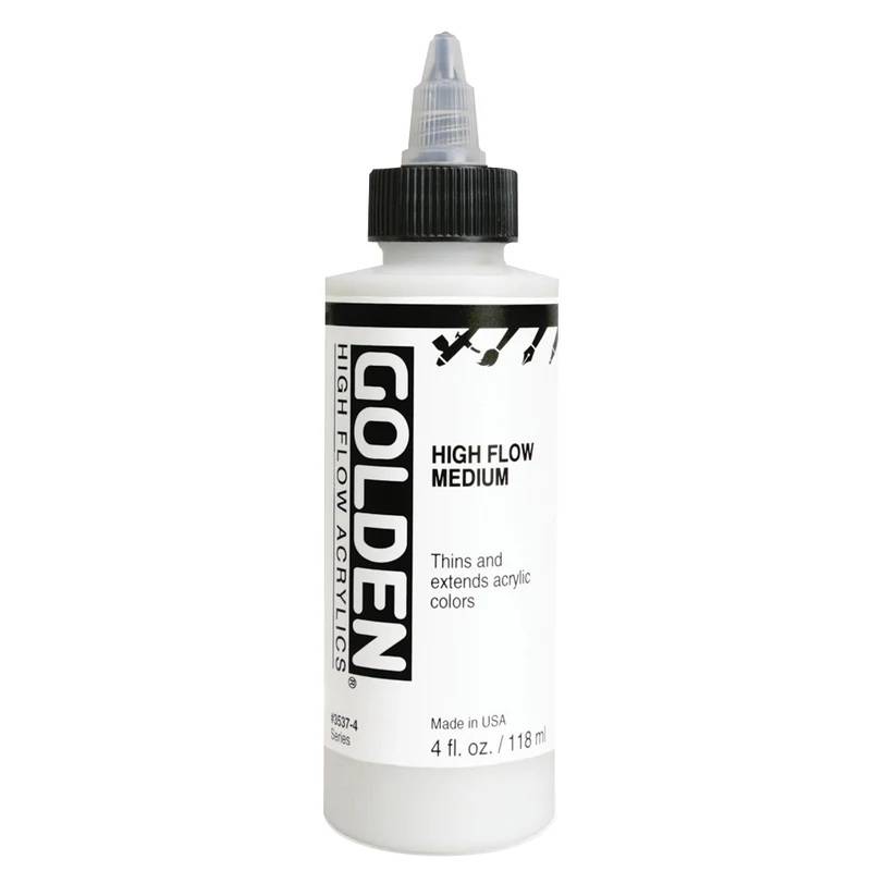 Golden High Flow Medium is een 100% acrylbindmiddelsysteem dat is ontworpen de High Flow Acrylics te modificeren voor een verhoogde transparantie en filmhardheid. High Flow Medium is ontwikkeld om te voldoen aan de hoogste eisen van professionele airbrush-illustratoren, heeft uitstekende spuiteigenschappen en is samengesteld om ophoping van sproeikopmateriaal, verstopping en oppervlaktedefecten te minimaliseren.