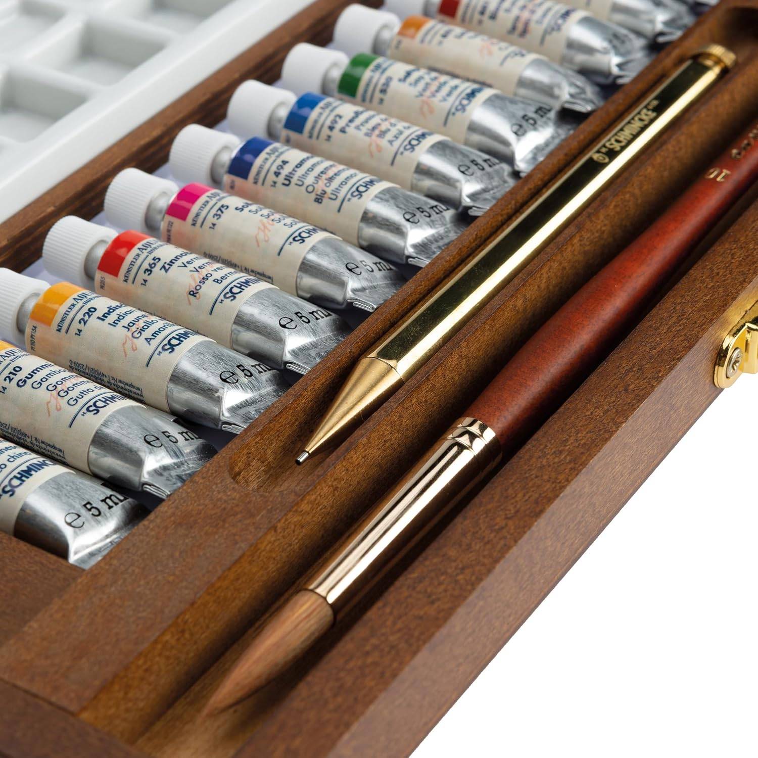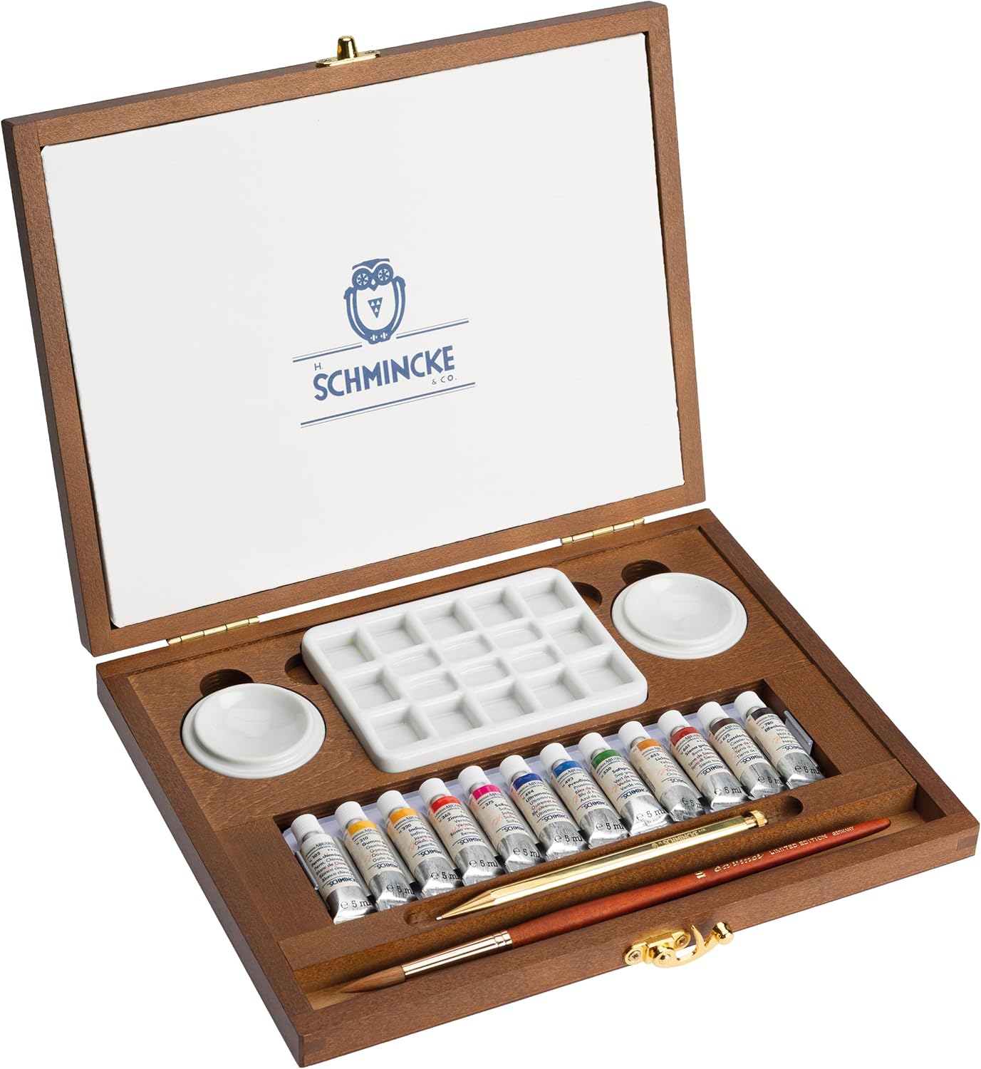 Daarnaast zit er in de set: 2 ronde porseleinen mengtegels, 2 recht porseleinen mengtegel met 18 vakjes, een Da Vinci limited edition penseel maat 10 en een Schmincke limited edition retro vulpotlood 0.9.