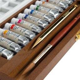 De kist bevat 6 tubes 12ml Horadam aquarelverf: 102 perm. chinese white, 210 gamboge gum, 220 indian yellow, 365 vermilion, 375 solferine, 494 ultramarine finest, 492 prussian blue, 530 sap green, 655 yellow ochre, 661 burnt sienna, 675 cassler brown, 780 ivory black.