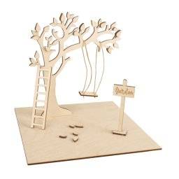 Afmetingen: grondplaat 21x21 cm, boom 18x19,2 cm, bladeren 0,8x1,5 cm + 0,7x1,2 cm, ladder 2,5x10,8 cm, bordje 3,5x9,6 cm, schommel 3,8x1,2 cm, 60 cm touw (100% hennep).