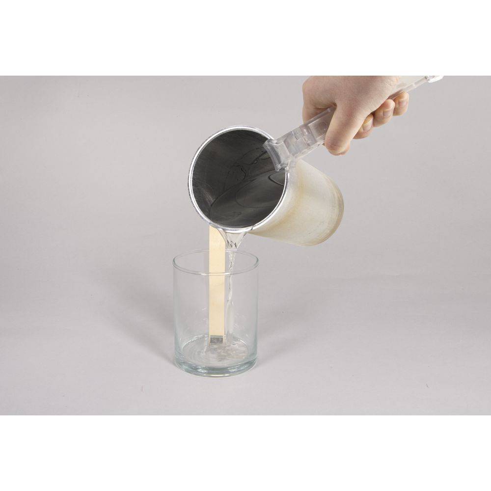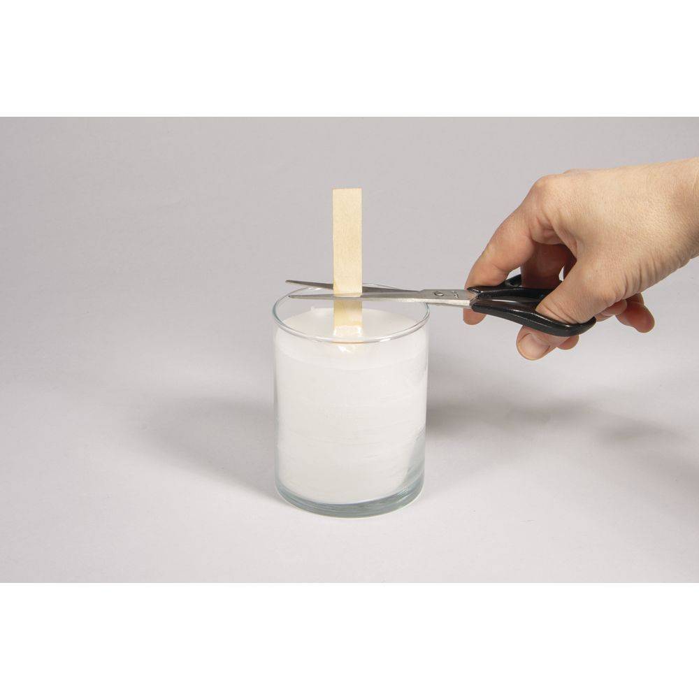 Gebruiksaanwijzing: Steek de houten lont, enkel- of dubbel, in de metalen basis, plaats deze in het potje en giet de paraffine erin. Knip de lont voor het aansteken af tot ongeveer 1 cm boven de paraffine.