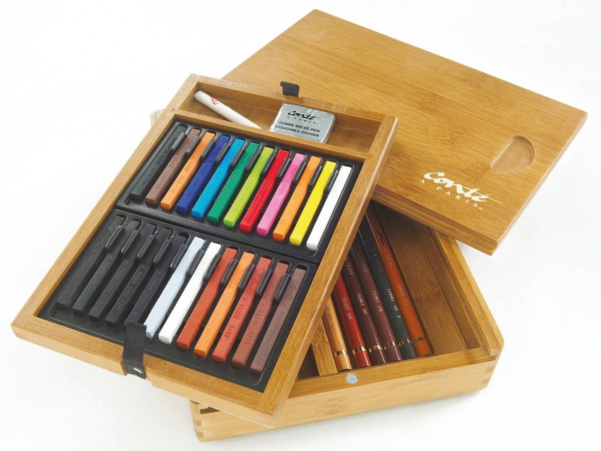 Inhoud van het kistje: 24 carré krijtjes, 6 conté pastelpotloden, kneedgum en doezelaars.