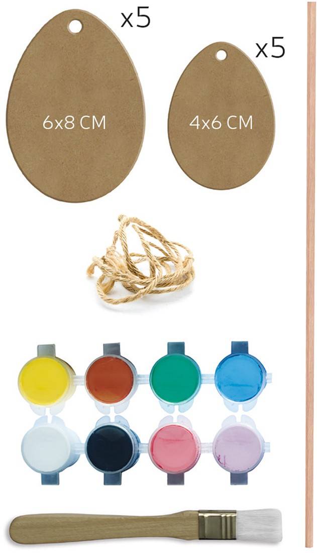 Deze complete DIY-knutselset biedt een praktische en creatieve manier om paasdecoratie te maken. De set bestaat uit 10 houten eieren die geschikt zijn om te schilderen en op te hangen, ideaal voor het vervaardigen van decoratieve paasornamenten. Dankzij het gebruik van duurzaam hout zijn de eieren stevig, herbruikbaar en eenvoudig te personaliseren.