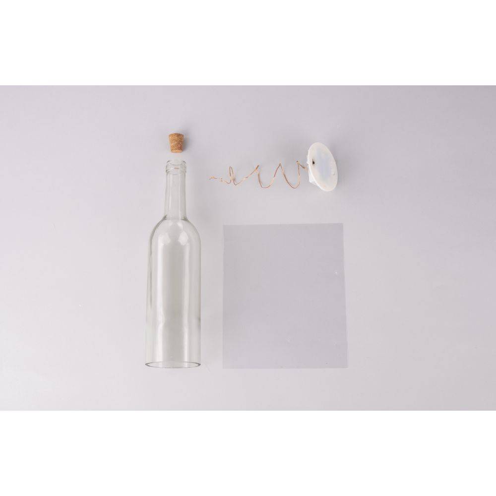 De set bevat alles om een geweldige lichtdecoratie te maken. Glazen fles met kurk, warm wit LED-lichtketting werkt op batterijen. )batterijen niet inbegrepen) Inclusief folie voor steroptiek.
