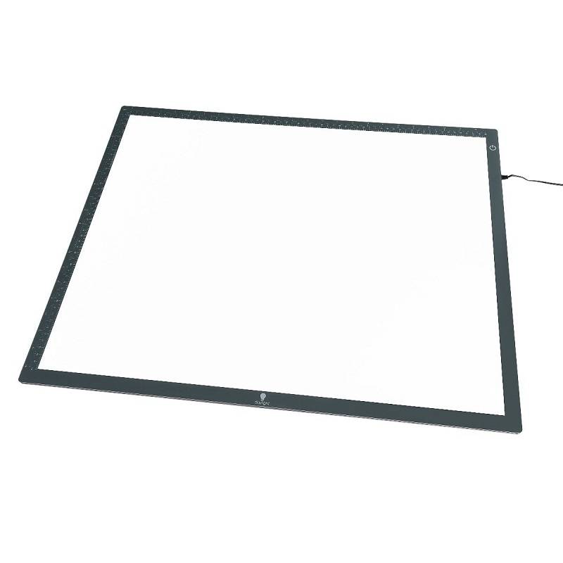 Pas de helderheid aan op basis van het gewicht van het papier of de dikte van de stof, en maak gebruik van de handige maataanduiding in centimeters en inches langs de randen van het werkoppervlak voor optimale precisie. Helder, slank en licht van gewicht – de Daylight Wafer Lightpad is een onmisbaar hulpmiddel