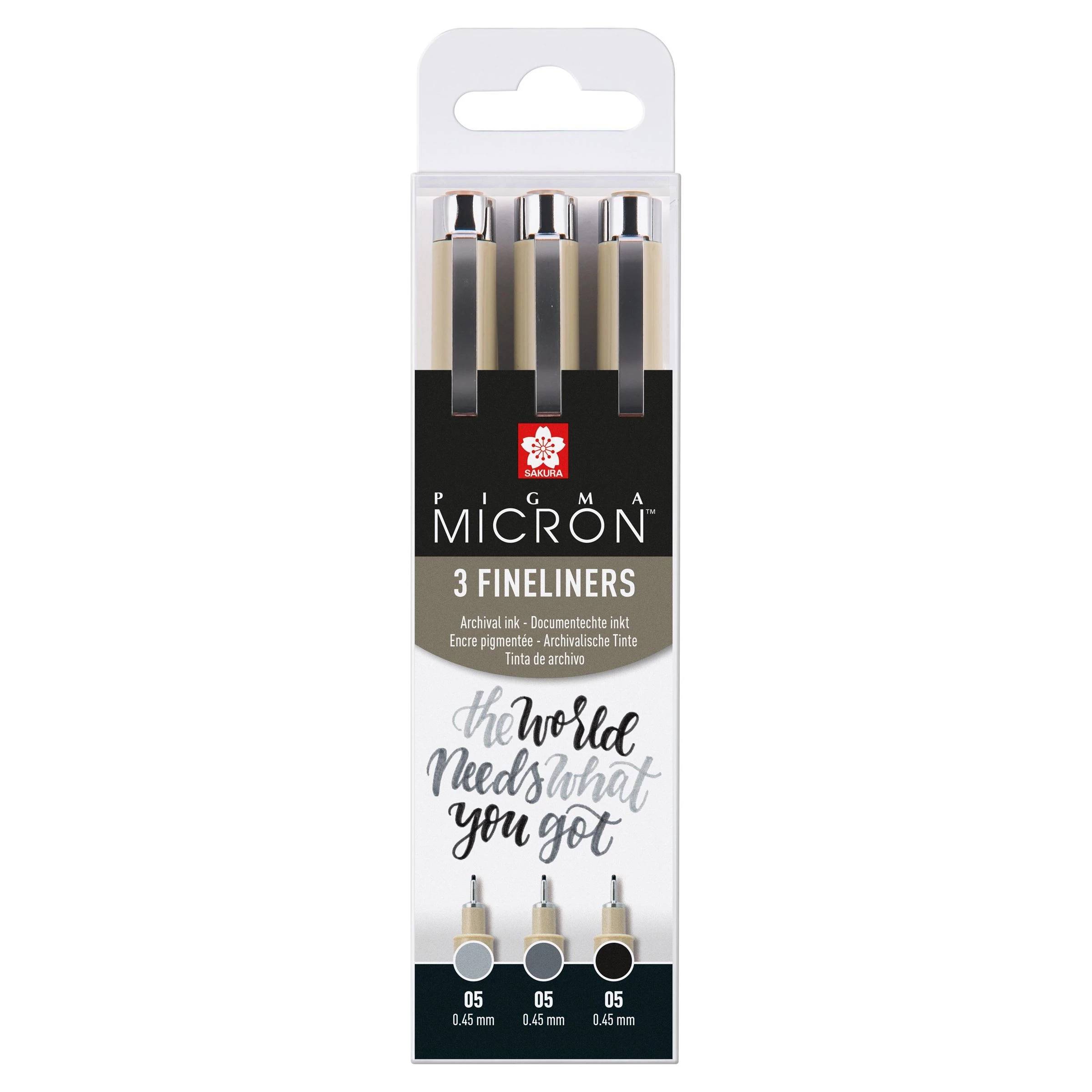 Selectie van 3 Pigma Micron 05 fineliners in de kleuren Zwart, Koelgrijs en Licht Koelgrijs (lijnbreedte: 0,45 mm). Met deze opbouwbare grijstinten en zwart kun je schaduwen, diepte, visuele accenten en lagen toevoegen aan illustraties, tekeningen, bullet journal spreads en nog veel meer.