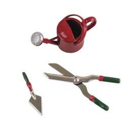 Gieter 4 x 1,8 x 2,5 cm, snoeischaar 4,3 x 0,8 x 0,4 cm, schepje 2,8 x 0,6 x 0,75 cm.