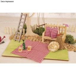 1 picknickkleed (10,2 x 9 cm),1 placemat (5,2 x 4 cm), 2 bierpullen (1,5 x 0,8 cm), 1 bierflesje (3,5 cm hoog, 1 cm diameter).