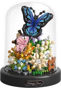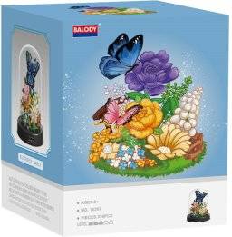 De 16369 Balody vlinderdans is een bouwblokjes bouwset van kunststof voor volwassenen en kinderen vanaf 6 jaar onder begeleiding. Deze microblocks bouwset wordt gewaardeerd om zijn kleurenpracht, de grappige witte besjes en vooral de schitterende paarse vlinder bovenop. We zien natuurlijk ook veel fleurige bloemen en nóg een vlinder, een roze. De chique stolp zorgt ook voor een stofvrij project.