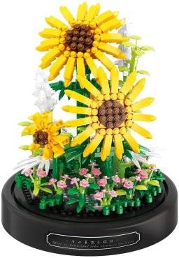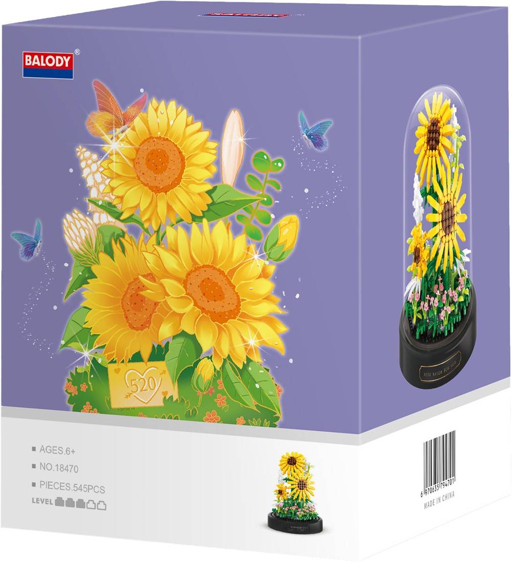 De Balody Zonnebloemen 18470 is een charmante kunststof bouwset van nanoblocks voor zowel volwassenen als voor kinderen vanaf 12 jaar. Deze set bevat een stolp met drie prachtige zonnebloemen, die achter “glas” geplaatst worden. De zonnebloemen stralen in hun levendige kleuren, terwijl de zwarte bodem met roze bloemetjes, witte margrieten en kleine bloemen de charme versterkt.