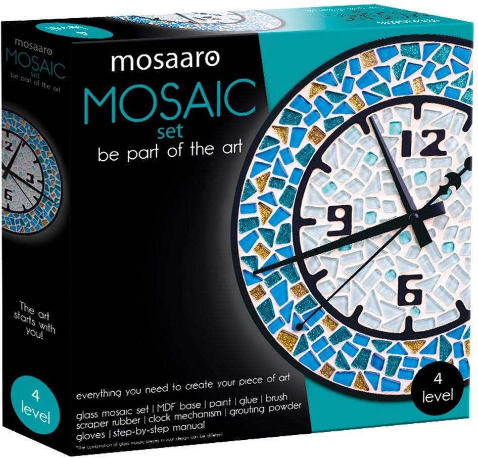 Elke set bevat alles wat je nodig hebt om een motief te maken, inclusief een MDF-houten basis (Ø 30 cm), glasmozaïek in vijf kleuren, een lijmset op waterbasis (40 ml), 20 ml acrylverf, een kwast, rubberen spatel, 180 g voegmiddel, een houten stokje, handschoenen, een spons, een maatbeker, een uurwerk en stapsgewijze instructies.