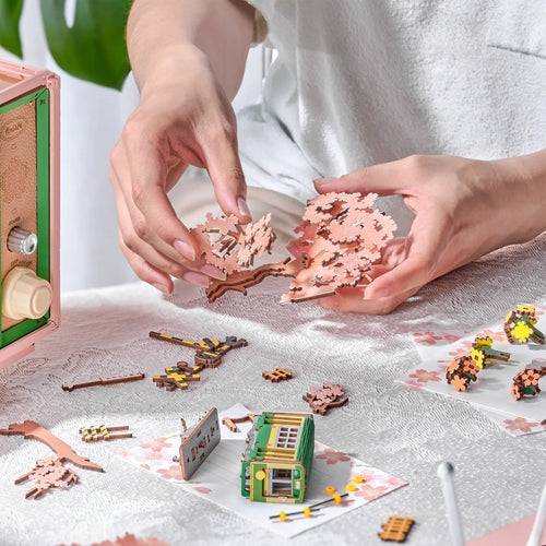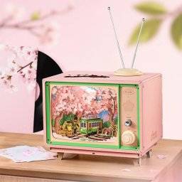 Sakura Dreamy Tour DIY Music Box 3D Wooden Puzzle is een nostalgische muziekdoos in de vorm van een retro televisie. Een groen trammetje rijdt tegen de klok in door een betoverend lentelandschap vol kersenbloesems, bloemen, bomen en paddenstoelen. Een spiegel, ledverlichting en een draaiknop voor licht en muziek creëren een rustgevende miniatuurwereld vol details. Een van onze meest originele bouwpakketten.
