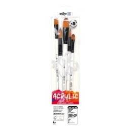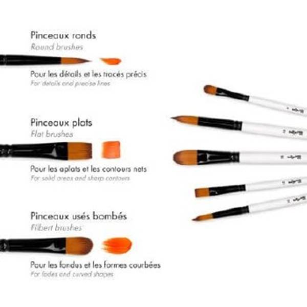 Deze set van 5 middelgrote penselen van synthetische vezels met witte stelen is perfect geschikt voor acrylverf, maar ook voor aquarel, inkt of olieverf. De set