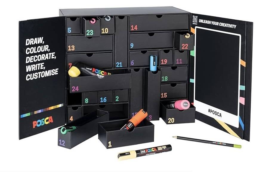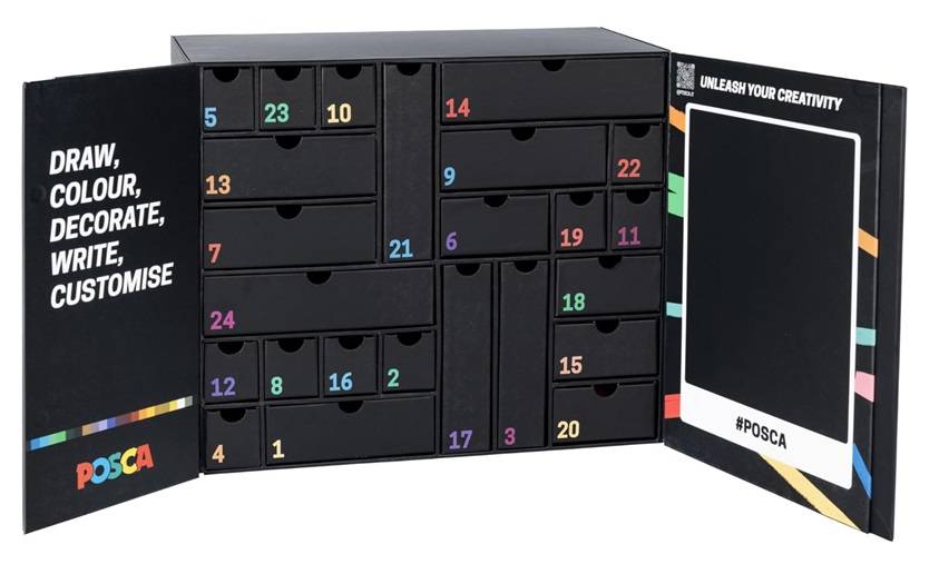 De Posca Adventskalender is een unieke manier om de dagen tot kerst af te tellen met creatieve verrassingen. Achter elk van de 24 vakjes bevindt zich een zorgvuldig geselecteerd Posca-product, variërend van markers tot andere schrijfwaren. Deze kalender is ideaal voor kunstliefhebbers, hobbyisten en iedereen die zijn of haar creativiteit wil uiten tijdens de feestdagen.