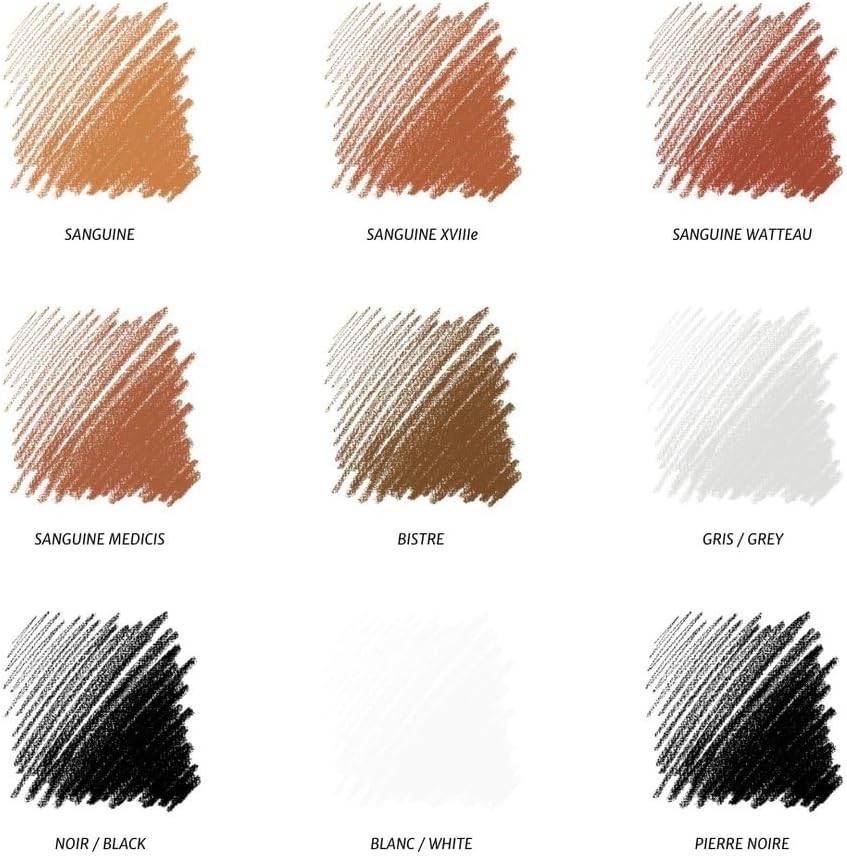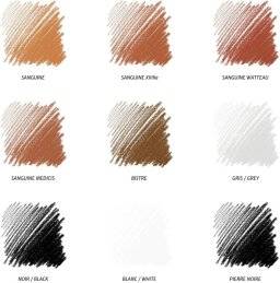 - 12 pastel carrés (bistre, sanguine, sanguine medicis, sanguine watteau, sanguine XVIII, gris, white, HB black, B black en 2x 2B black.