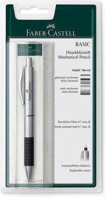 Mooie uitstraling, comfortabel en plezierig om mee te schrijven, dat zijn de kwaliteiten van de BASIC schrijfwaren. Ideaal voor beroep en vrije tijd. Schacht van hoogglanzend metaal. Ergonomische grip met zachte laag, contrasterende kleuren. Metalen clip. Vervangbare gum onder de drukknop. Schrijfbreedte 0,7mm. Hardheid B. Matte chromen houder.